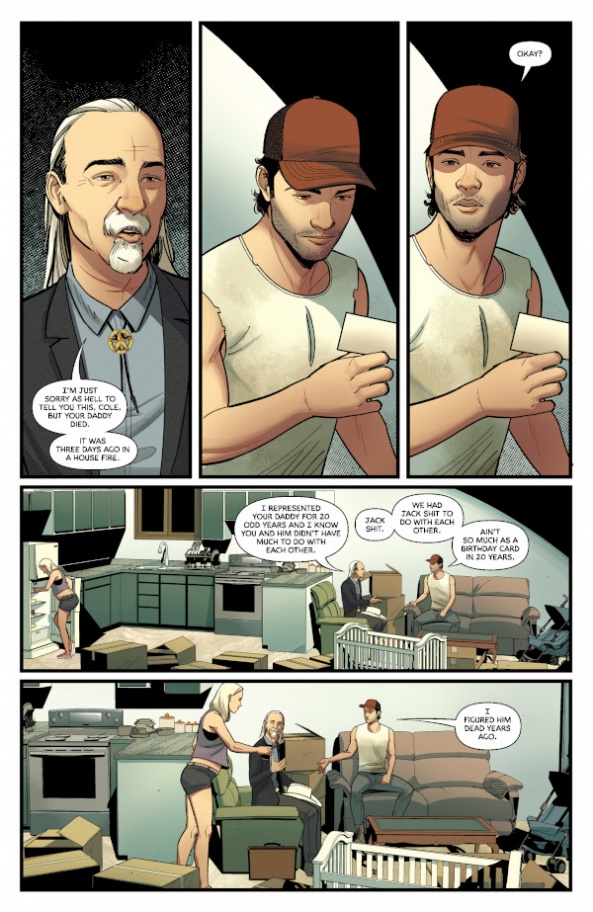 JM: I usually call it– or at least I think of it as a small town crime. That’s sort of the overarching genre. And then we come at it from different ways. I feel like I’m lucky that’s the kind of story Axel likes, right? That’s job number one. If Axel likes it, we can get started. So luckily he is. And small town crime kind of stuff, you see that in film and television a lot. With comics, it gets a little under represented. There’s still stuff out there. I love most of it. Any of it I get my hands on. I feel lucky to have found a publisher who believes in that stuff and sees what I’m shooting for at least.