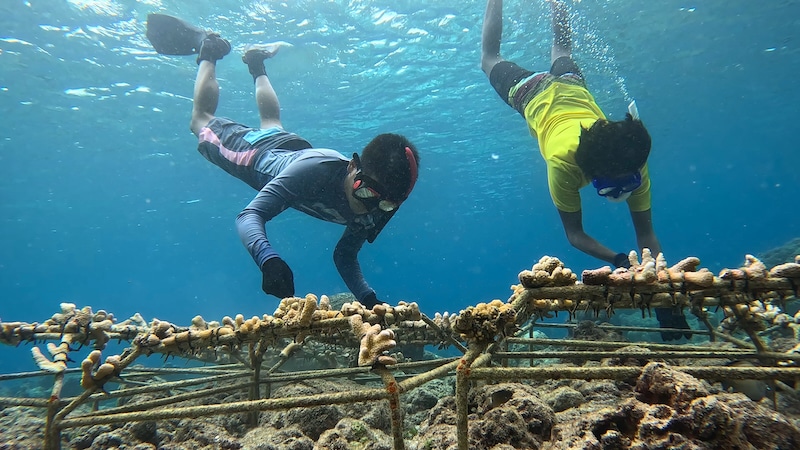 Divers in the Maldives clean coral frames with toothbrushes. Zachary Wong / SeaVoice