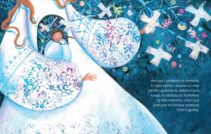 “A profound picture book that aims at discovering the strong bond between kids and moms. The scent is the tool of a baby’s recognition and stays in our memory. Also it’s a strong metaphor of belonging and identity. Such true origins teach the language of cosmos.