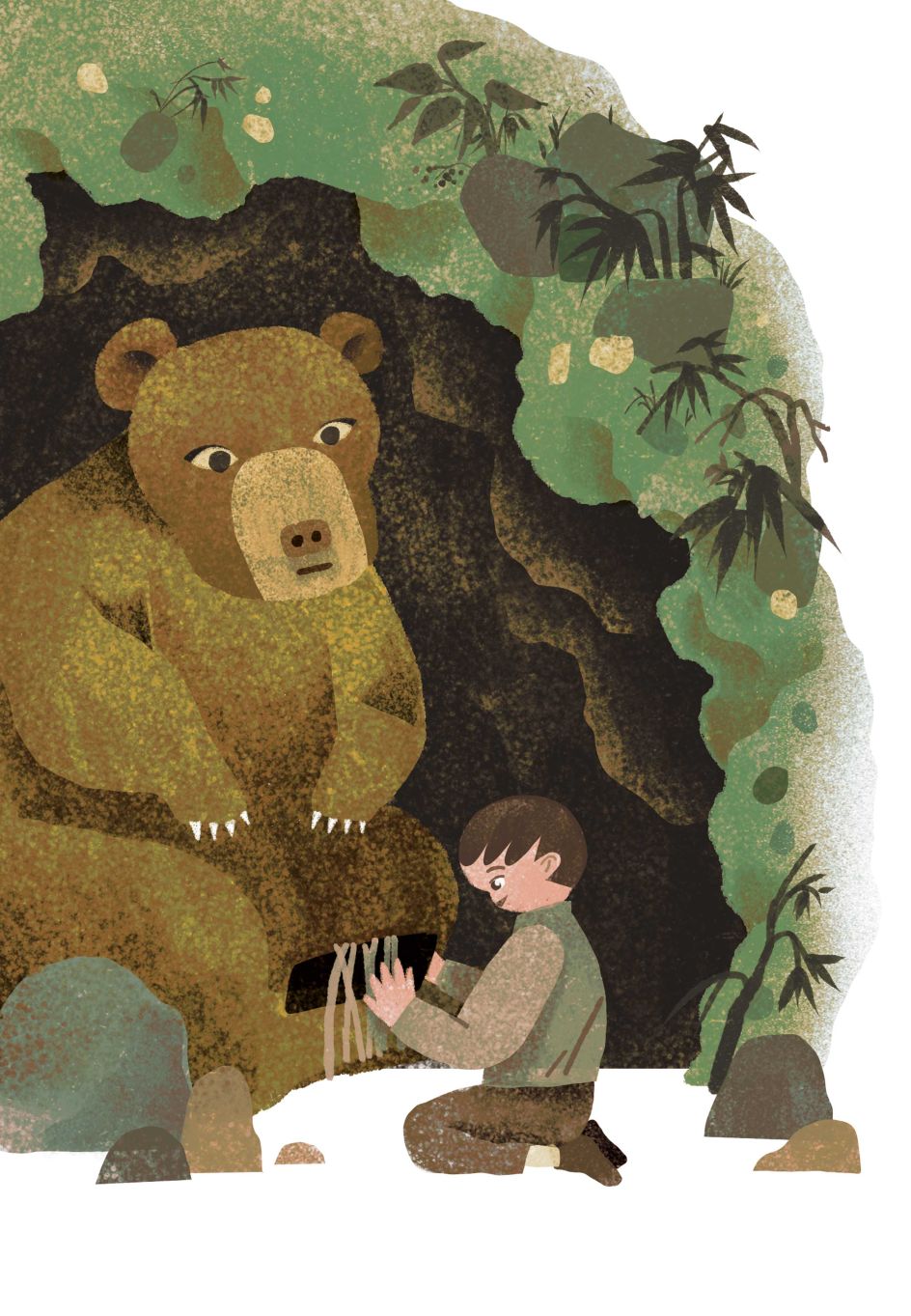 “This fiction book was different; it featured main characters,” she tells Creative Boom. “The first step for me was to create character studies for the hunter, Mu Zhuang, and his son, Ding. Surprisingly, the editors were quite satisfied with my initial designs, so I continued using these designs throughout the story.”