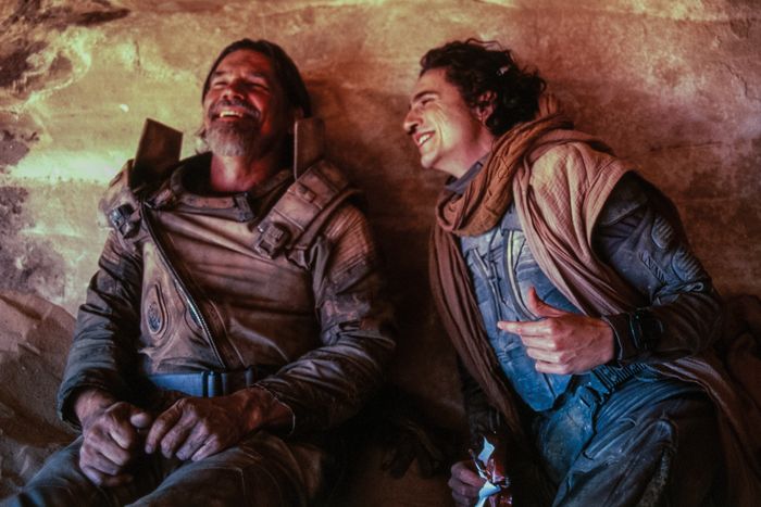 “It’s time to consume again,” Josh Brolin wrote on Instagram ahead of the Dune 2 premiere, “and experience that amazing feeling of when the lights go down, you have your hand deep in your Popcorn worm, and DUNE 2 consumes you.” Brolin’s Instagram captions, like his poetry in the new, behind-the-scenes book Dune: Exposures (which came out February 13 and became an Amazon best seller), project a playful enthusiasm for all that’s around him. Working in tandem with Dune cinematographer Greig Fraser, the two have combined Brolin’s words and Fraser’s behind-the-scenes photography to try and capture the ethereal and bizarre feeling that was all those months out in the desert and seeing Stellan Skarsgård in all those lumpy prosthetics as the Baron Harkonnen. (“Sleeping held at bay by our anticipation of what gem tomorrow holds” is paired with a photo of Skarsgård, glaring at the camera.) The poems are slippery, open-ended, and full of the actor’s now-signature affection for his co-stars and crewmates, or as Brolin himself puts it: “I was bowled over by my experience in the desert. I felt so incredibly insignificant, which became addictive.”