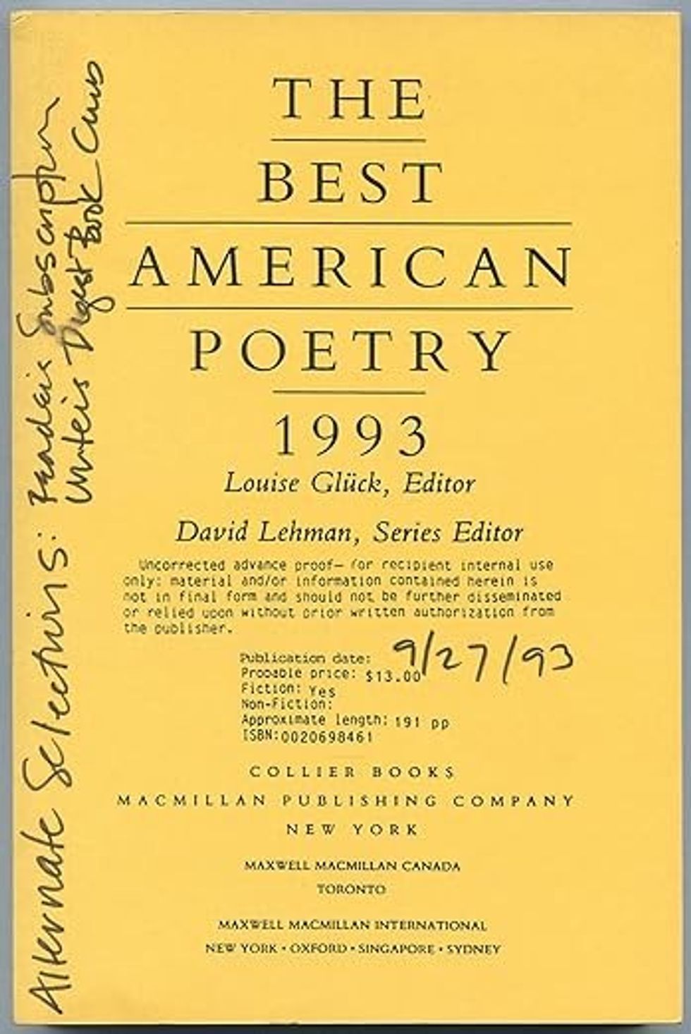 “In my world, Glück can do no wrong. I found this 1993 poetry collection by chance and was blessed by so many gems from Charles Simic, Michael Palmer, Tess Gallagher, and Mary Oliver.”