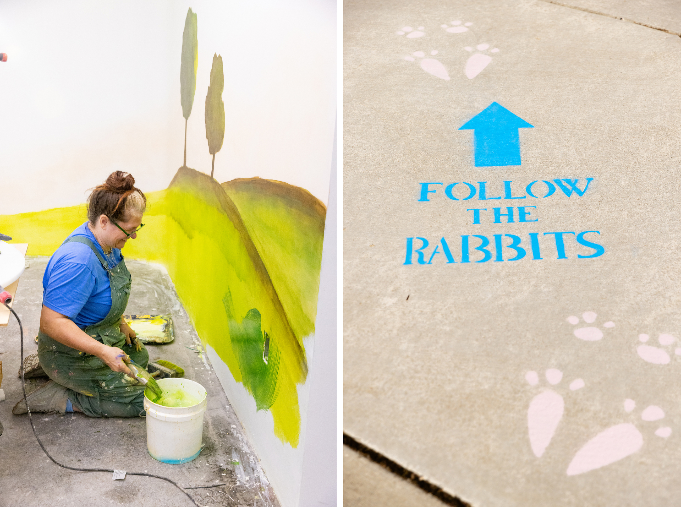 Left: Fabricator Gen Goering paints the walls of an exhibit before the museum opened to the public. Right: Rabbit feet and arrows mark the sidewalks outside of The Rabbit hOle.