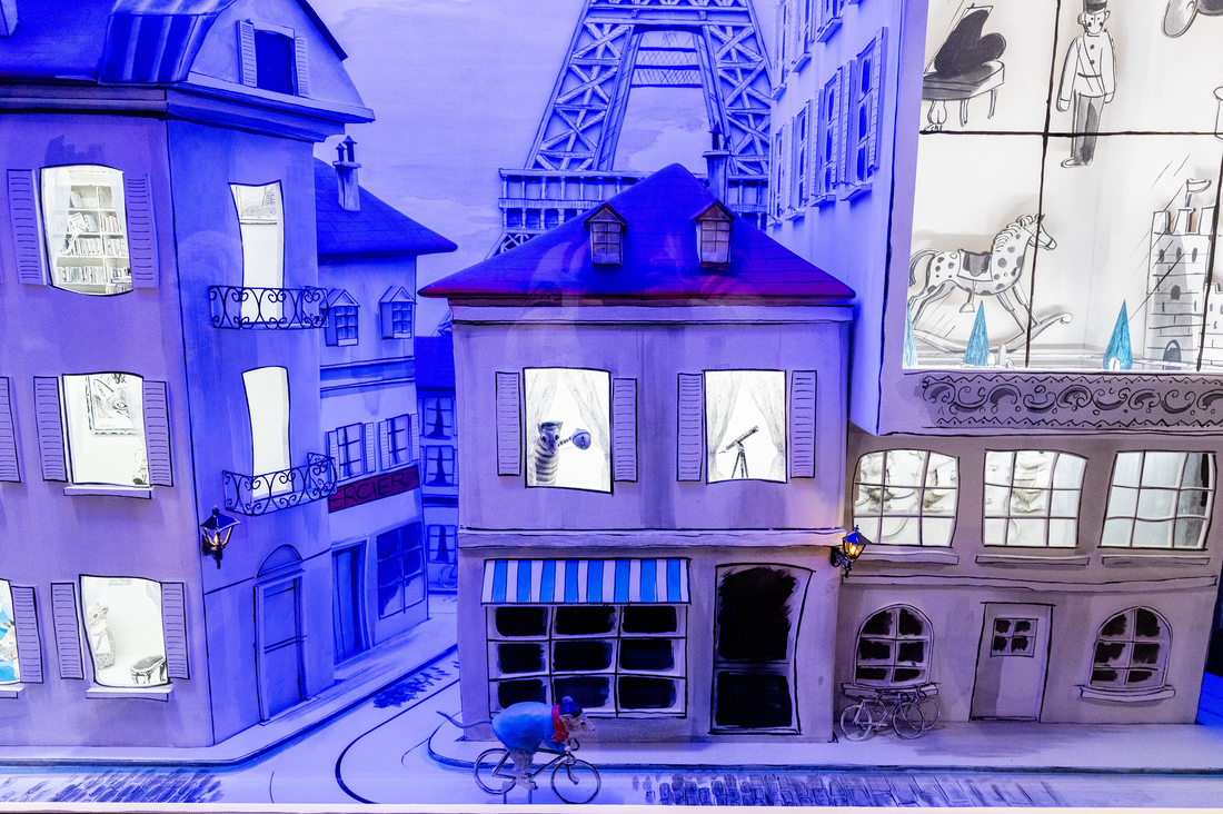 A mouse on a bike from the book Anatole, by Eve Titus, rides around a display of Paris.