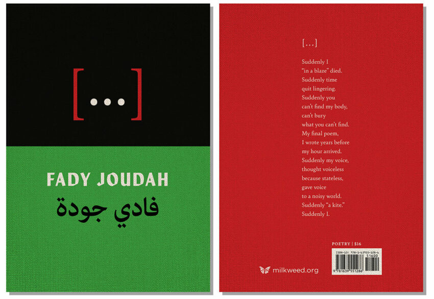AA We are in a moment of severe censorship; language feels charged and flammable. In Germany, for example, protesters are forbidden to shout the slogan “From the river to the sea.” Some maps plainly erase the names of old Palestinian villages. Hence it’s not surprising that when I encountered the title […] my mind immediately filled in the blank with the word “Palestine,” or its true Arabic name, “Falastin.” But reading the poems, I am less certain. […] is elusive, shimmering, expansive. The ellipsis ruptures and silences but also allows for our imagination to take root. How did you arrive at this title?