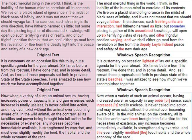 Microsoft’s Windows Speech Recognition came in last. Its accuracy on Lovecraft was 84.3%, although it did not miscapitalize any words like GDVT. For Brown’s speech, it got its highest accuracy rating of around 94.8%, making it equivalent to GDVT.