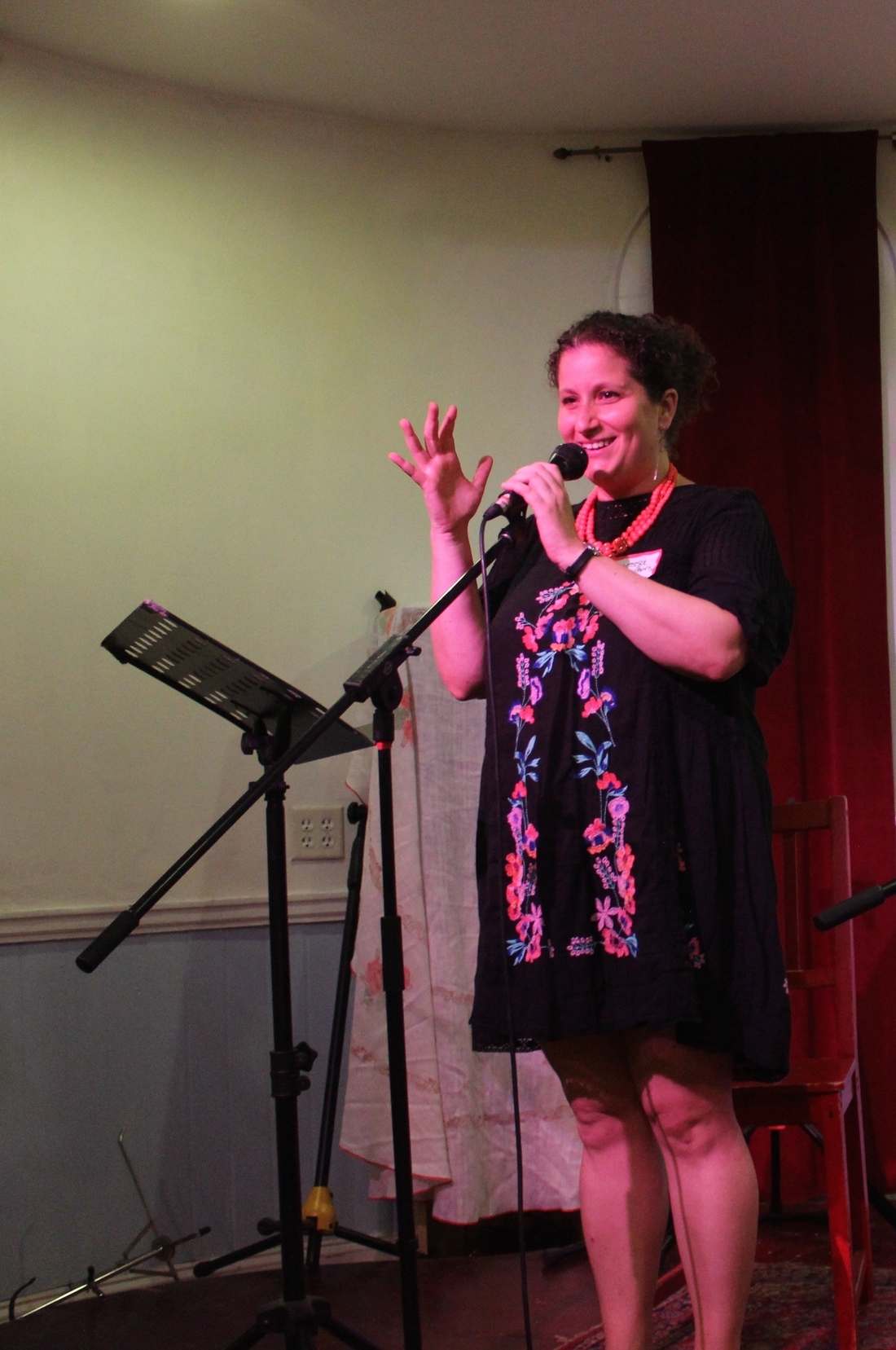 Vanessa Zoltan welcomes an audience for an event about treating romance novels as sacred text.
